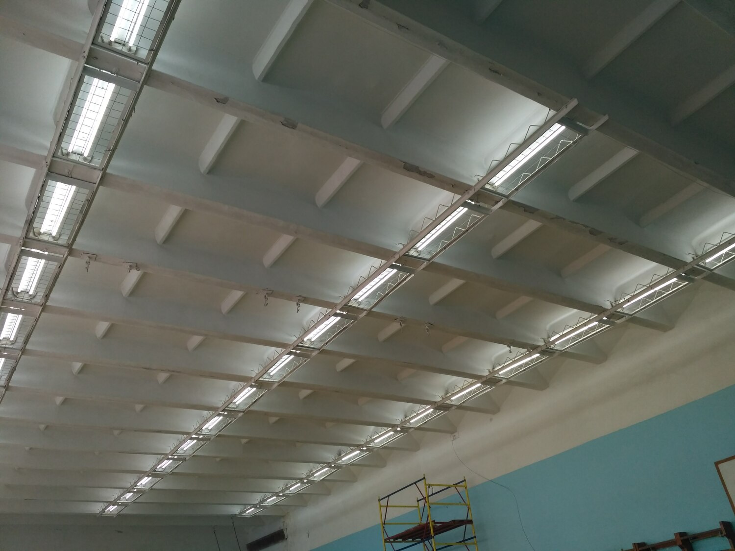 Замена люминисцетных ламп мощностью 36 Ватт на 19-ти ваттные светодиодные лампы в спортивном зале СОШ №1 селе Петровка Красногвардейского района.Заменили 72 лампы.