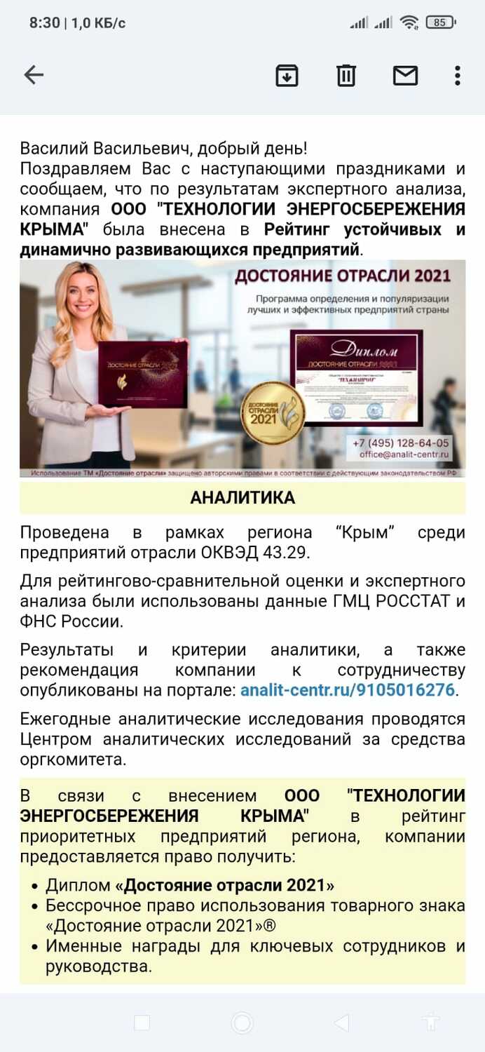 По итогам экспертной оценки финансово-экономических показателей предприятия и отрасли, организация отнесена к числу рекомендованных и по итогу ранжирования вошла в Рейтинг устойчивых и динамично развивающихся предприятий. Экспертный анализ проведен среди 7735 компаний отрасли и предприятий региона. Результат исследования может свидетельствовать о надежности и приоритетности организации при сотрудничестве.Рейтинг устойчивых и динамично развивающихся предприятий Область 2021 год Регион 2021 год №ОрганизацияОбщаяоценкаКлючевые показатели экспертного анализаЧистаянормаприбылиКоэффициентобеспеченностисобственнымисредствамиКоэффициентконцентрациисобственногокапиталаКоэффициенттекущейликвидности4ООО "КЕРЧЬЛИФТ"1883345ООО "ОВД-МОСТ"24115536ООО "КВК СЕРВИС"2627897АО "КРЫМЭЛЕКТРОМАШТОРГ"30411788ООО "ВИДЕОКОД"30126669ООО "ТЕХНОЛОГИИ ЭНЕРГОСБЕРЕЖЕНИЯ КРЫМА"336891010ООО "КМНУ-14"37109117Оценка в рамках ОКВЭД: 43.29 Производство прочих строительно-монтажных работРегион аналитики: «Крым, Республика»Группа AAA - Предприятия наивысшей категории надёжности региона